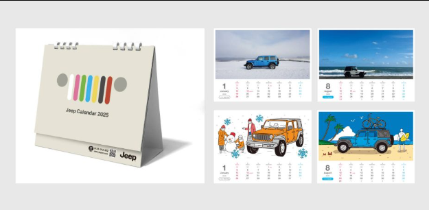 期間中、ジープ正規ディーラーにて「プレゼント引き換えクーポン」を提示の上、アンケートに回答および試乗いただいた方にプレゼント。一面は季節の色をテーマに募集したオーナー様の写真を、もう一面は本カレンダーのために描き下ろした温かいタッチのイラストをデザインしました。雪の中で、満開の桜の下で、青々とした樹々の間で…。